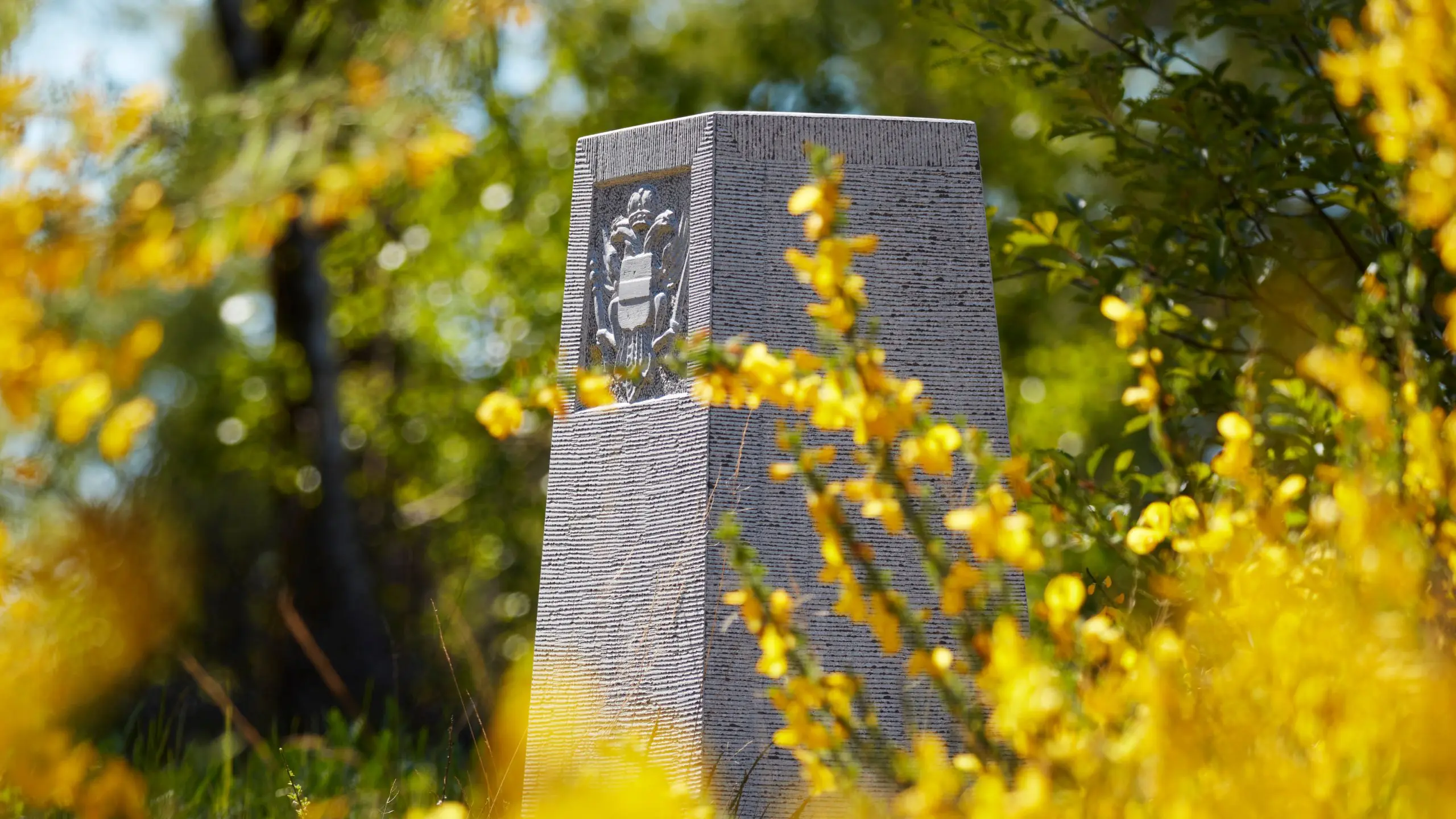 De huidige replica van de grenspaal aan de Toeristenweg, te midden van bloeiende brem