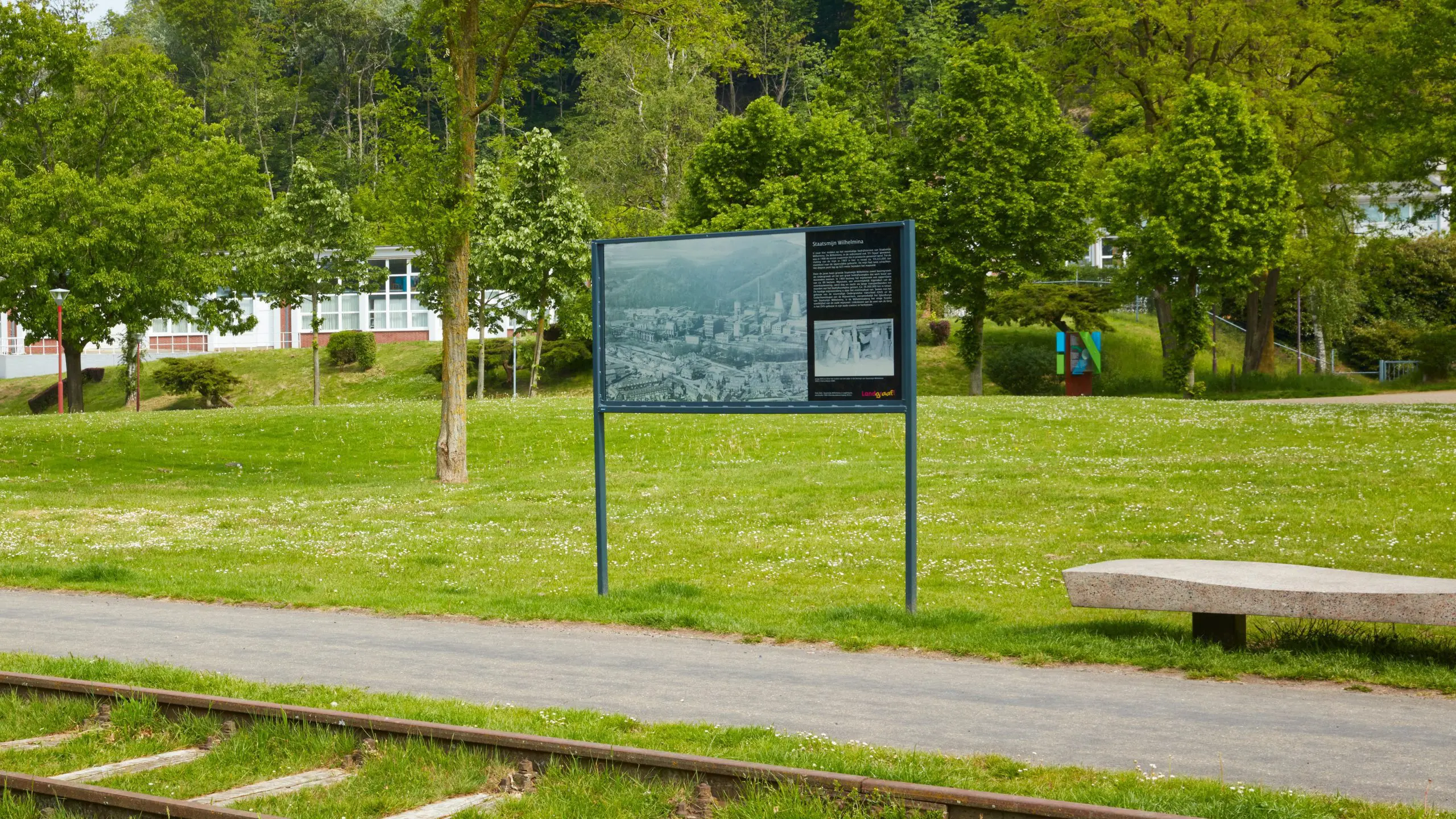 De gemeente Landgraaf maakt cultuurhistorisch erfgoed beleefbaar. Ontdek Landgraaf is daar een mooi voorbeeld van. Maar hoe maak je in de openbare ruimte iets zichtbaar dat er niet meer is? Het antwoord is een tijdvenster. Een venster dat uitzicht biedt op het verleden. In dit geval op het verdwenen bedrijfscomplex van Staatsmijn Wilhelmina, waarvan alleen de Ondergrondse Vakschool/Technische Vakschool resteert. Wie goed naar het tijdvenster kijkt, herkent dit gebouw aan de voet van de Wilhelminaberg. Het tijdvenster is in november 2018 onthuld. Het bankje ernaast is gemaakt van vermalen mijnsteen. Dit meubel is geschonken door IBA Parkstad.